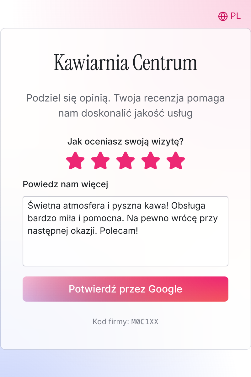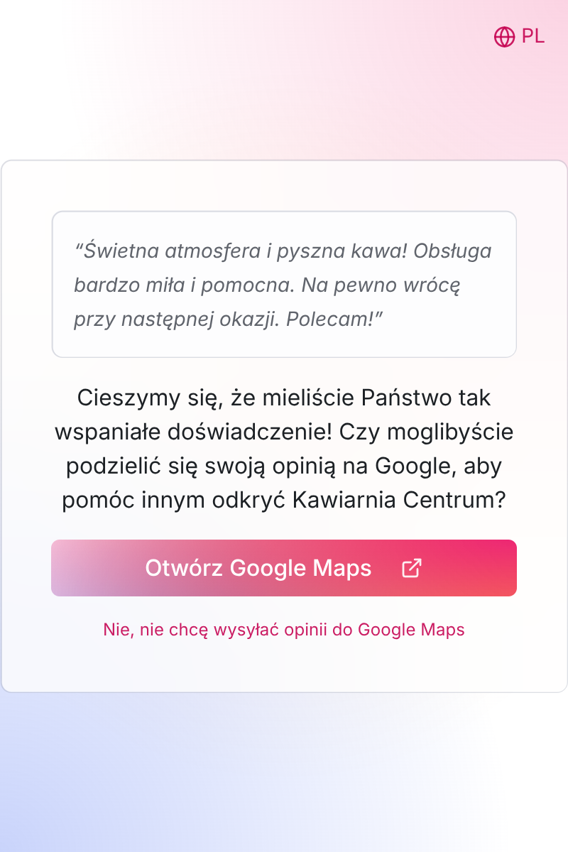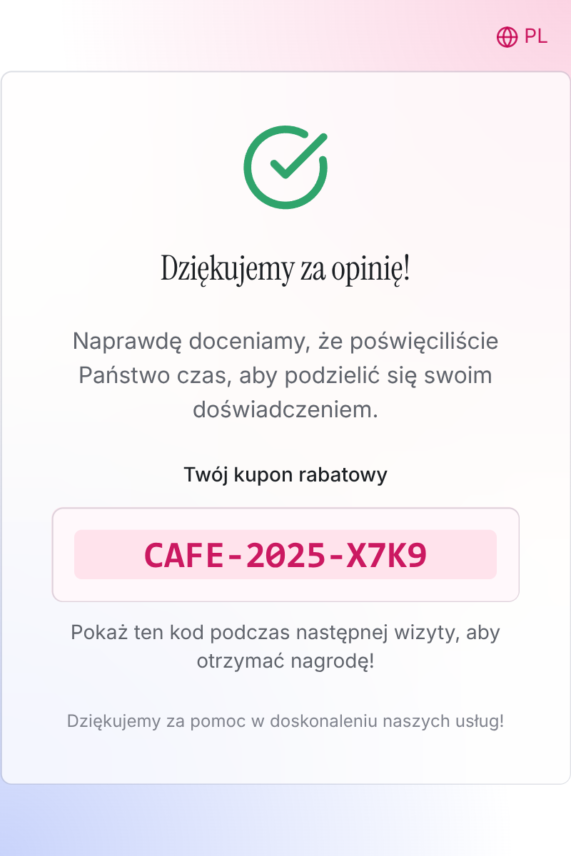 Klienci skanują, oceniają, gotowe. Bez instalacji aplikacji, bez komplikacji.Automatyczne nagrody