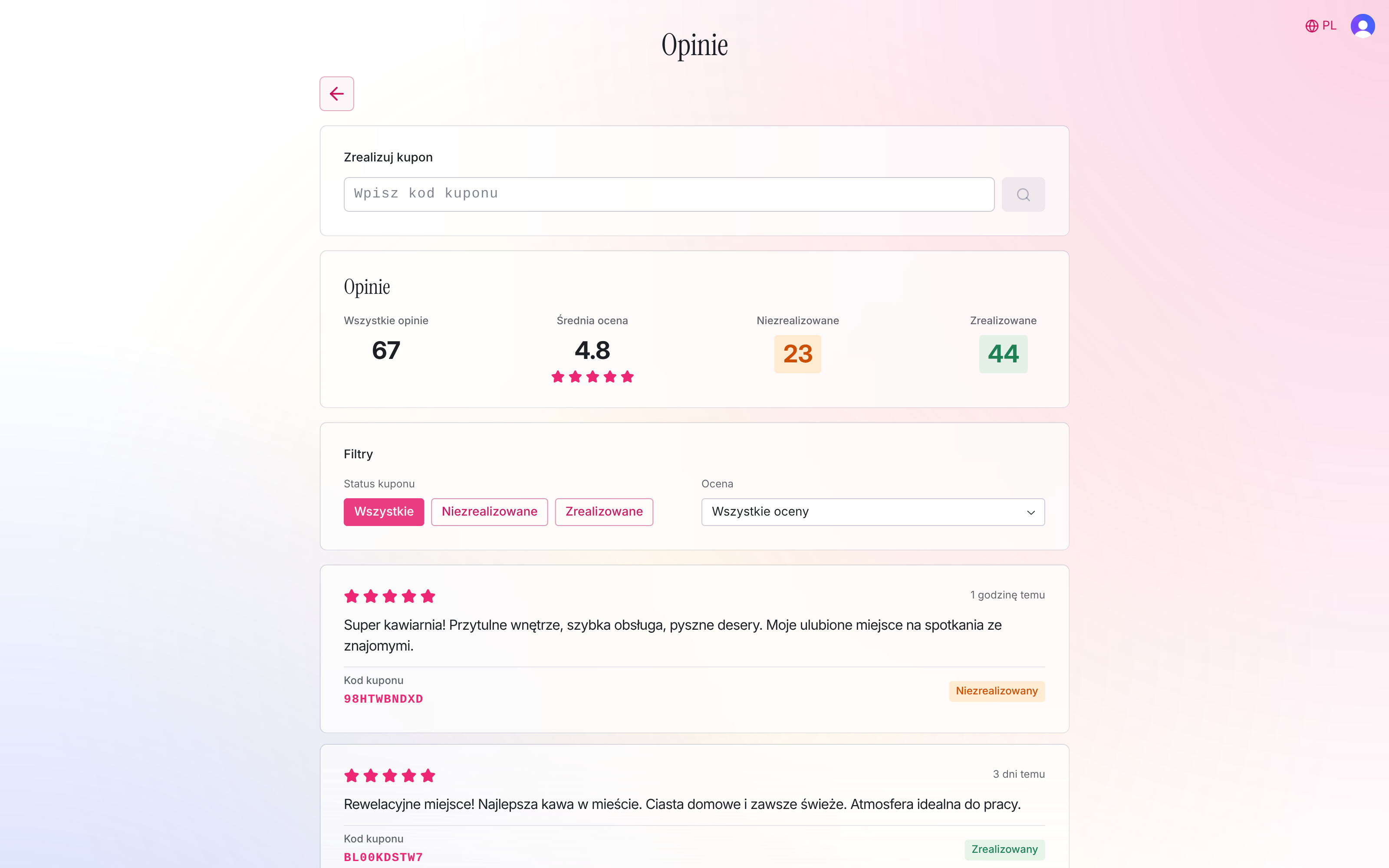 Personel sprawdza kupony po kodzie. Jedno kliknięcie, aby zrealizować.